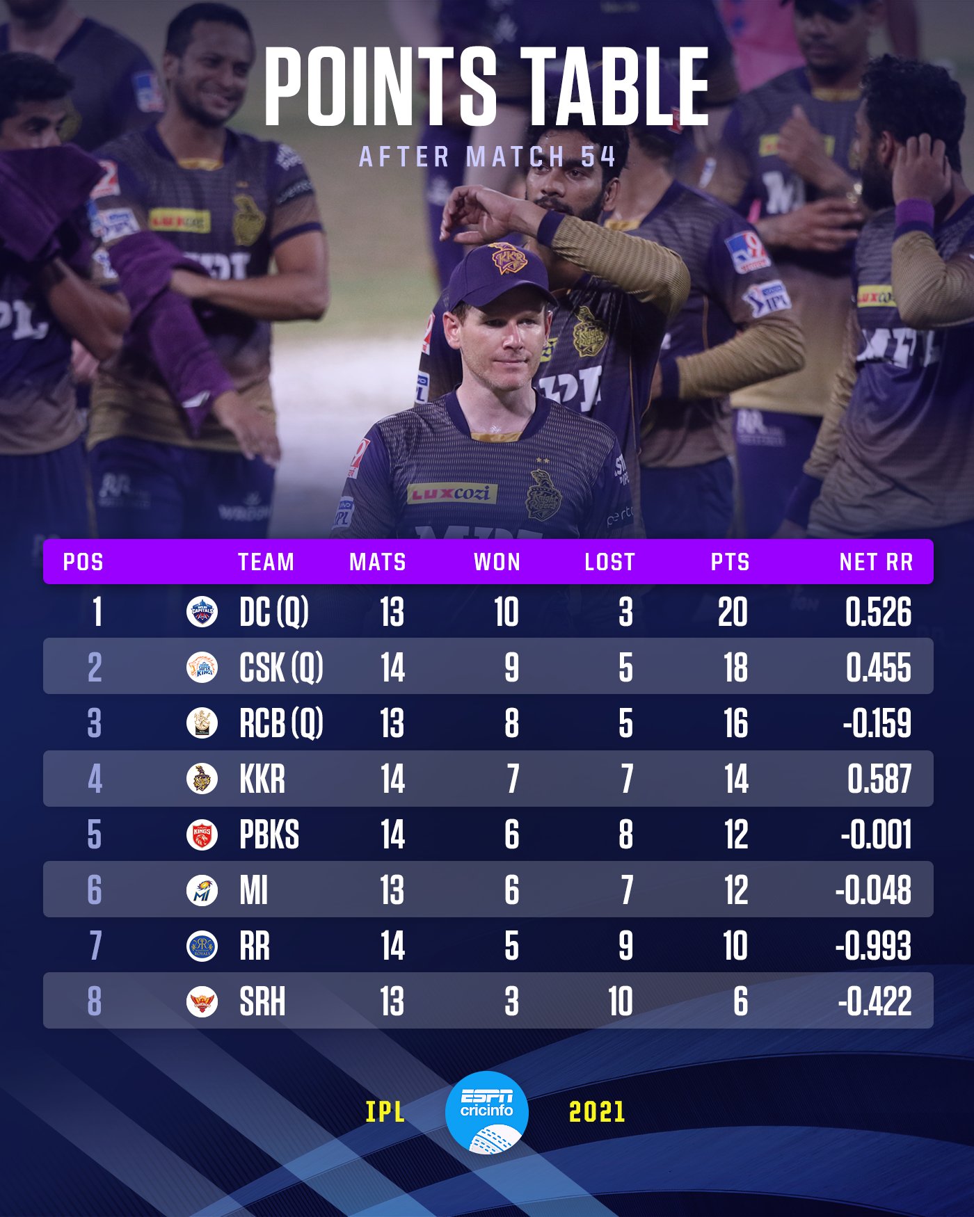 Dc vs kkr espncricinfo. Delhi Capitals vs Kolkata Knight Riders Qualifier 2 Kolkata Knight Riders opt to bowl Commentary Summary DC - 351 DC - 351 Player RB 4s 6s SR Prithvi Shaw 18 12 2 1 150 lbw b Chakaravarthy Shikhar Dhawan 16 16 0 2 100 batting Marcus Stoinis 1 3 0 0 3333 batting Extras 0 nb 0 b 0 penalty 0 w 0 lb 0 Total 35 51 ovrs 1 Wkts RR 677 Bowling Bowler O M R W Shakib Al Hasan 2 0. Assessing the bowling department of both teams Hogg noted that there is very little to separate them from with DC coming out on top with. Check IPL 2021 MATCH HIGHLIGHTS DC vs KKR Latest Cricket Updates IPL 2021 Qualifier 2.